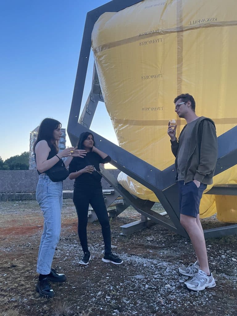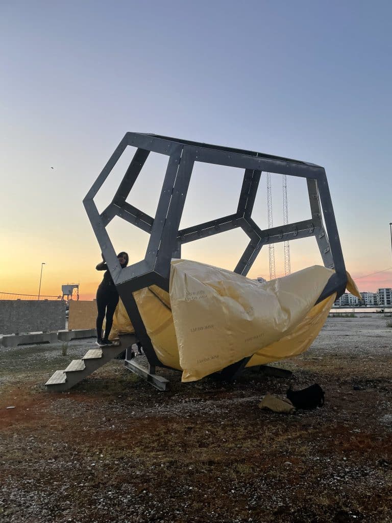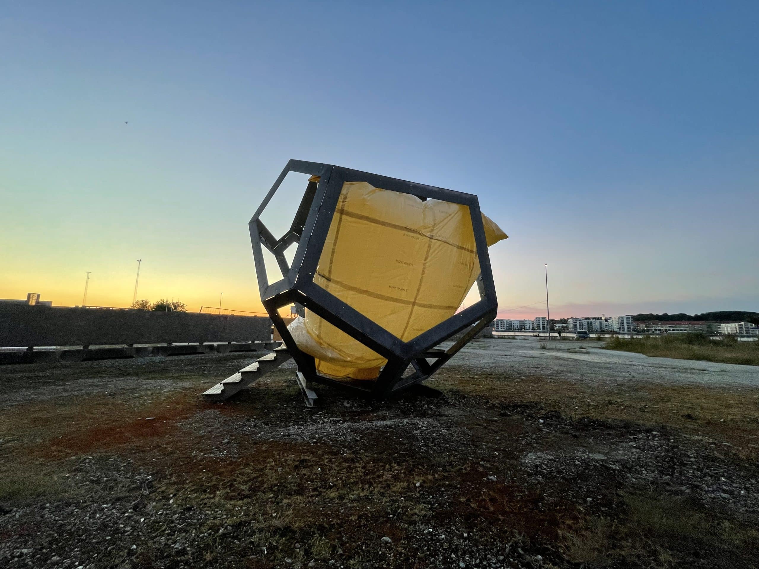 Aalborg’s Kunsthal Spritten is an art centre to be, for years under construction amidst controversy and delays. In front of the main building stands a metal structure, supposedly the first piece of ‘Cloud City’ a larger installation by Tomás Saraceno, rusted by time and smelly from the stale water that sits at the base. To advance the emergence of art we temporarily seised the artless art centre and appropriated it with air.