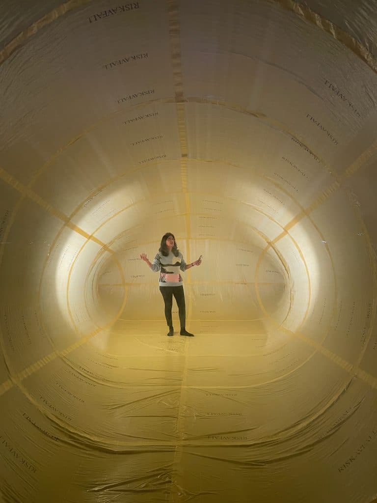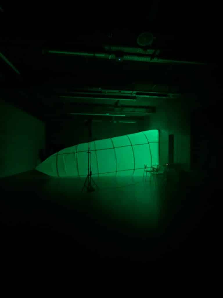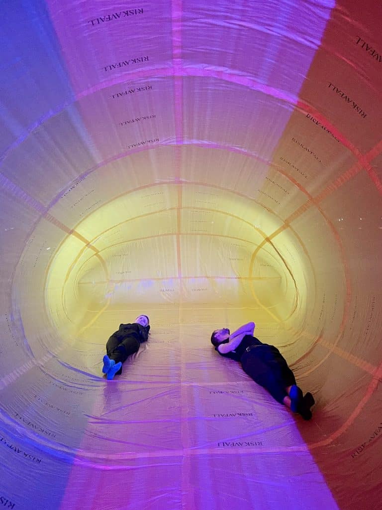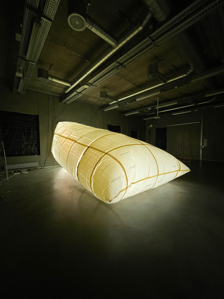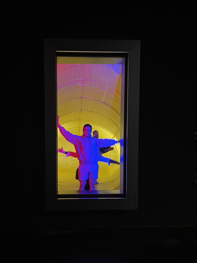 Display is an immersive pneumatic installation, a yellow inflatable structure designed to be entered. Once inside, the visitor encounters a rectangle of light, its colors and shifting patterns oscillate between hypnotic and blinding. At the center of this rectangle lies a reflective surface, as light floods the interior of the inflatable, the center gradually transforms into a mirror. The brighter the illumination, the more complete the reflection.