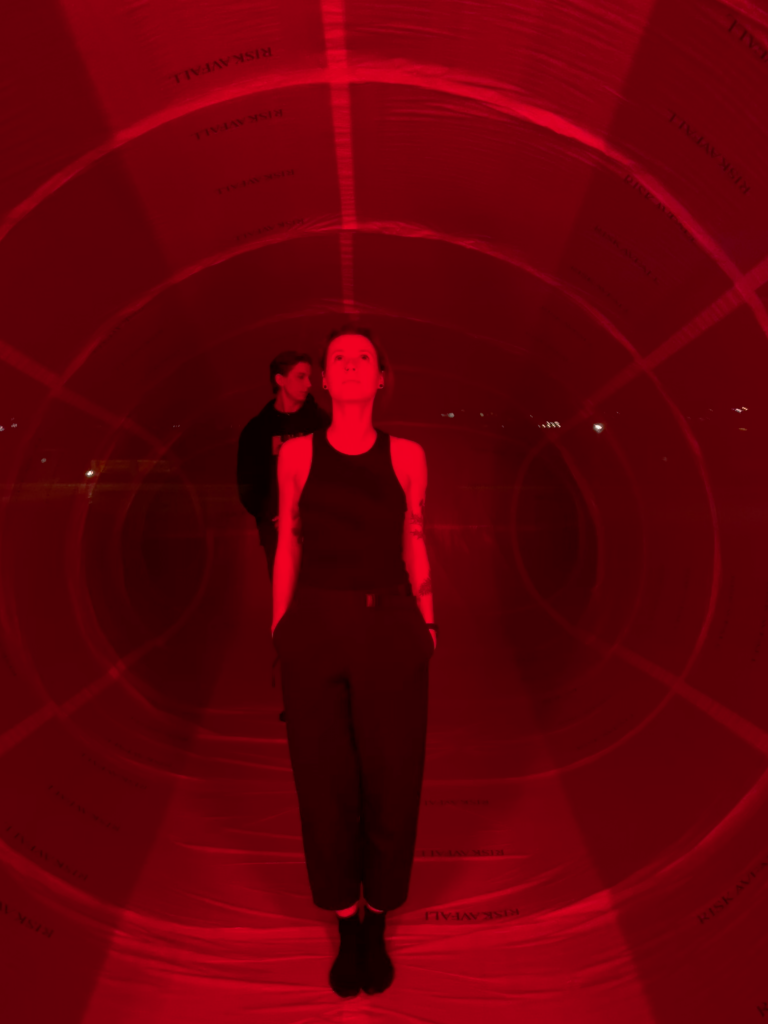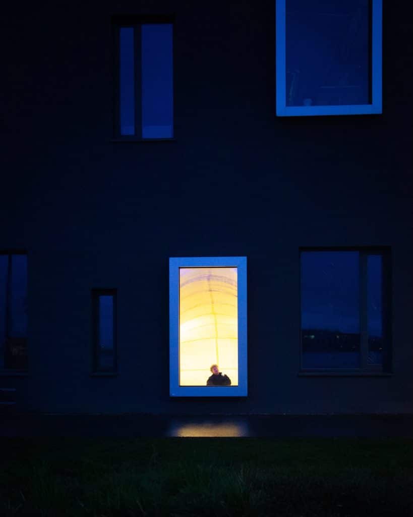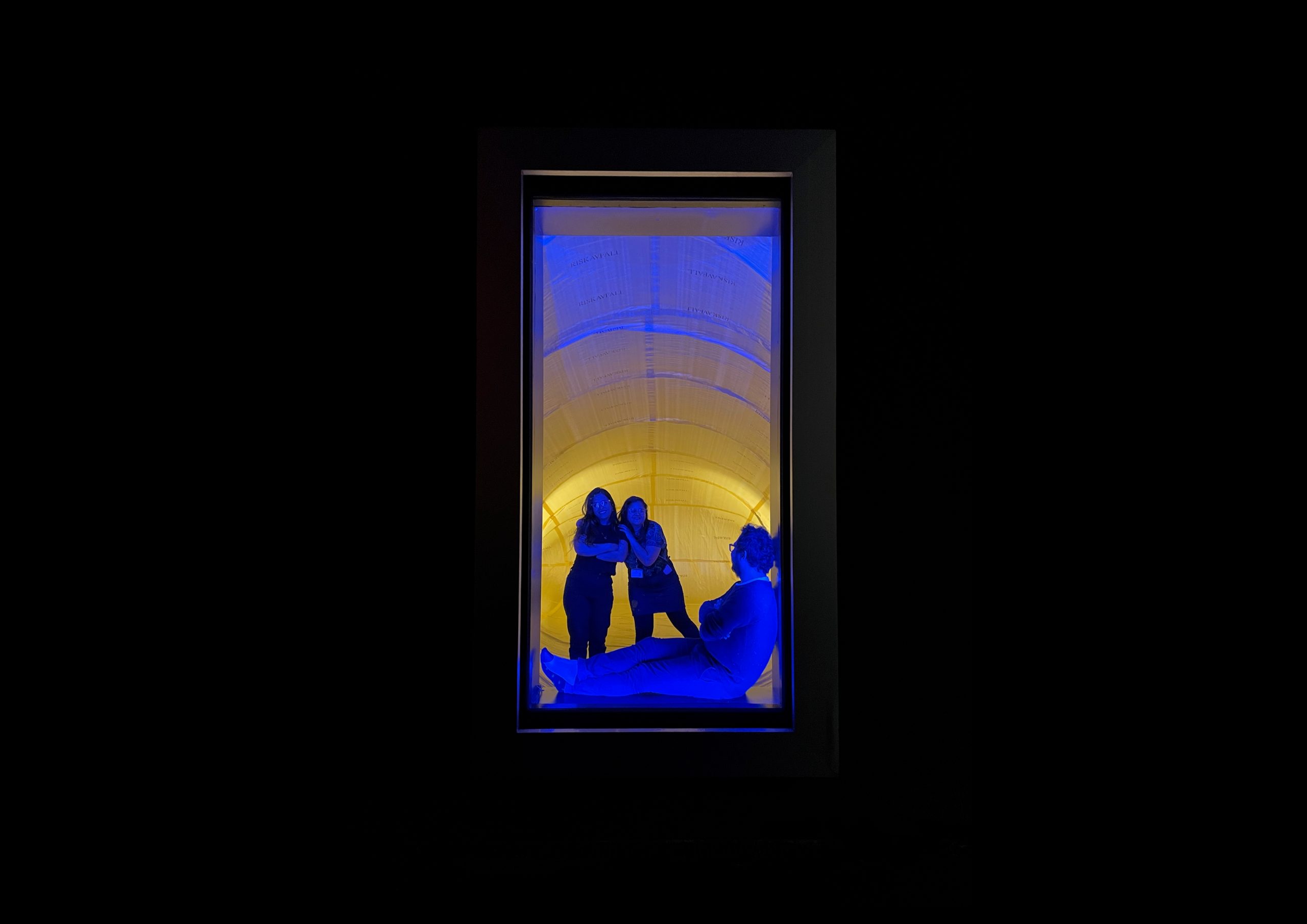 From the outside of the building, the vertical window glows like a phone screen, transforming the building façade into a display surface. Inside, the visitor inhabits a paradox: the space is simultaneously private and exposed, intimate and surveilled. Not unlike social media, the inflatable renders human behaviour visible to passersby while the occupant sees only their own reflection. From within, the window becomes a mirror. From outside, it’s a display.