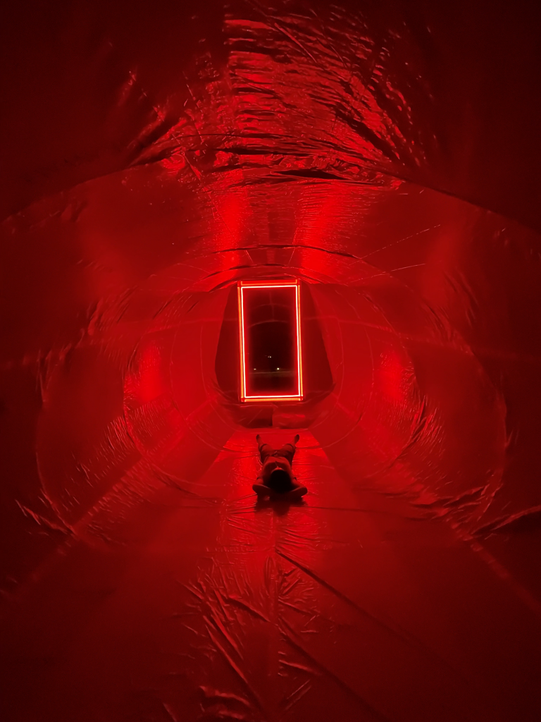 In truth, the rectangle of light is a window to the exterior of the building. By entering the inflatable, one becomes exposed to the gaze of passersby in the night. The differential in lighting creates an asymmetrical visibility: those outside can see clearly into the inflatable through the window, while those inside perceive only their own reflection.